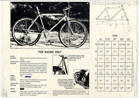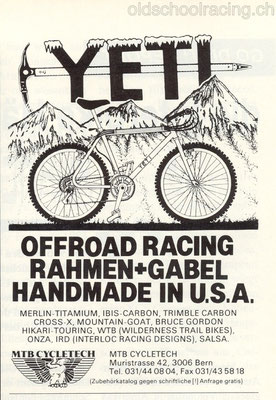 The Yeti cult was initiated by a testreport in the Mountainbike Action Magazine. Yeti founder John Parker appreciated the support of MBA editor Zapata Espinoza. The name Yeti became immortal, when bike legend John Tomac signed for Yeti by a handshake on his return from Europe where he was a raodbike pro at Seven Eleven team.